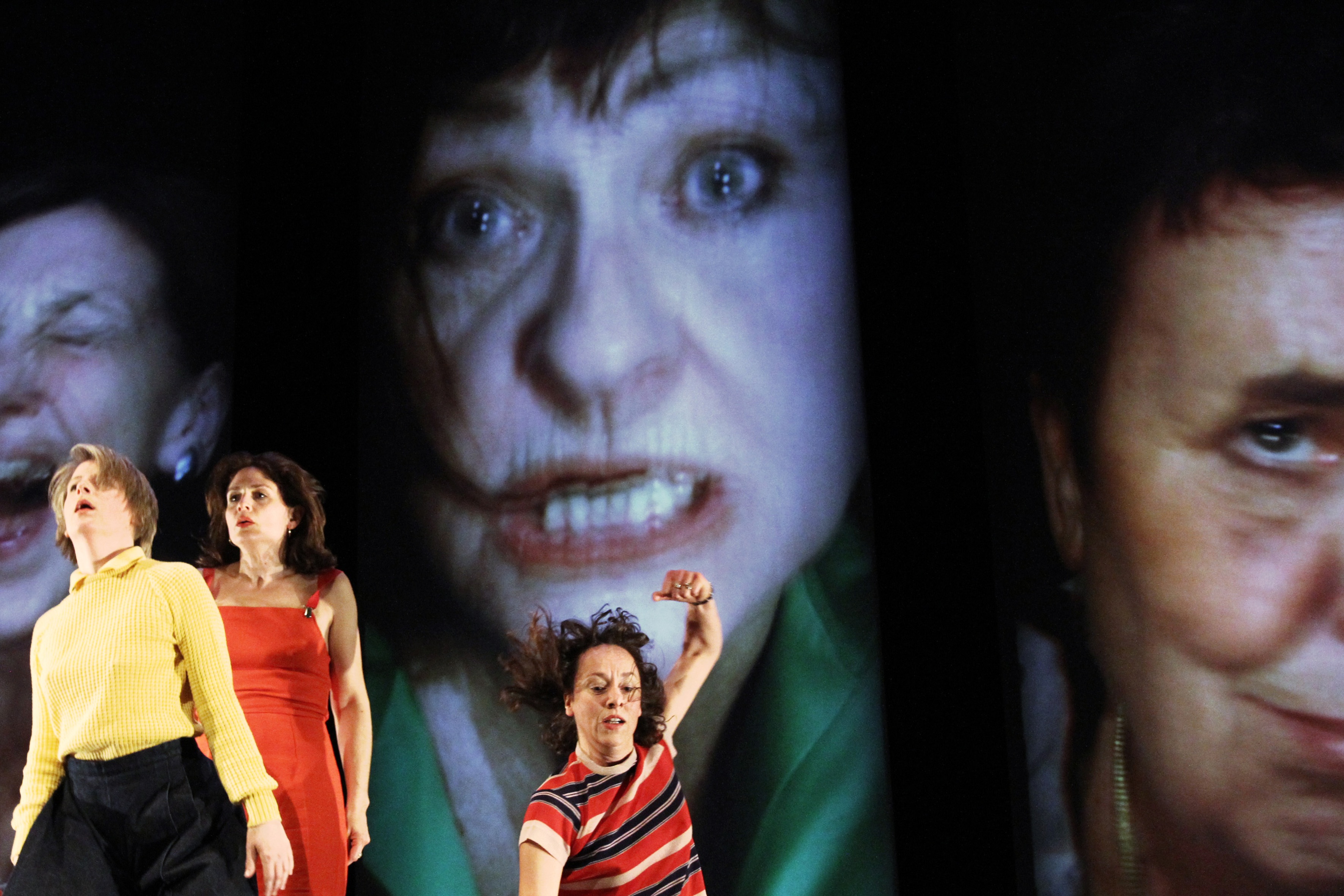 Die Mütter sind mit den Schauspielern anwesend – so wie die Mütter einer jeden Person durch die Prägungen und Einflüsse aus Kindestagen permanent mit anwesend sind, denn „Wir sind alle Kinder von Müttern“, wie Sebastian Bark zu Beginn des Stückes formuliert. Doch sind wir dadurch auch Opfer? Oder machen wir durch unsere Existenz gar unsere Eltern zum Opfer? Dies sind die Fragen, die die Performer stellen und dann durch musikalische Zuhilfenahme des Stückes „Frühlingsopfer“ von Igor Strawinsky tänzerisch ausfechten. Unter Einbindung der halbtransparenten Videoprojektion wird getanzt; was zwischendurch wie ein Fiebertraum anmutet, ist eine intermediale Videoperformance, die mit Projektion und Überschneidung arbeitet. Die Kinder werden im Verhältnis zu ihren Eltern gezeigt, in kämpferischer Auflehnung, aber auch in körperlicher Anlehnung, wie wenn Sebastian Bark sich in der Projektion plötzlich im Schoß seiner Mutter wiederfindet.