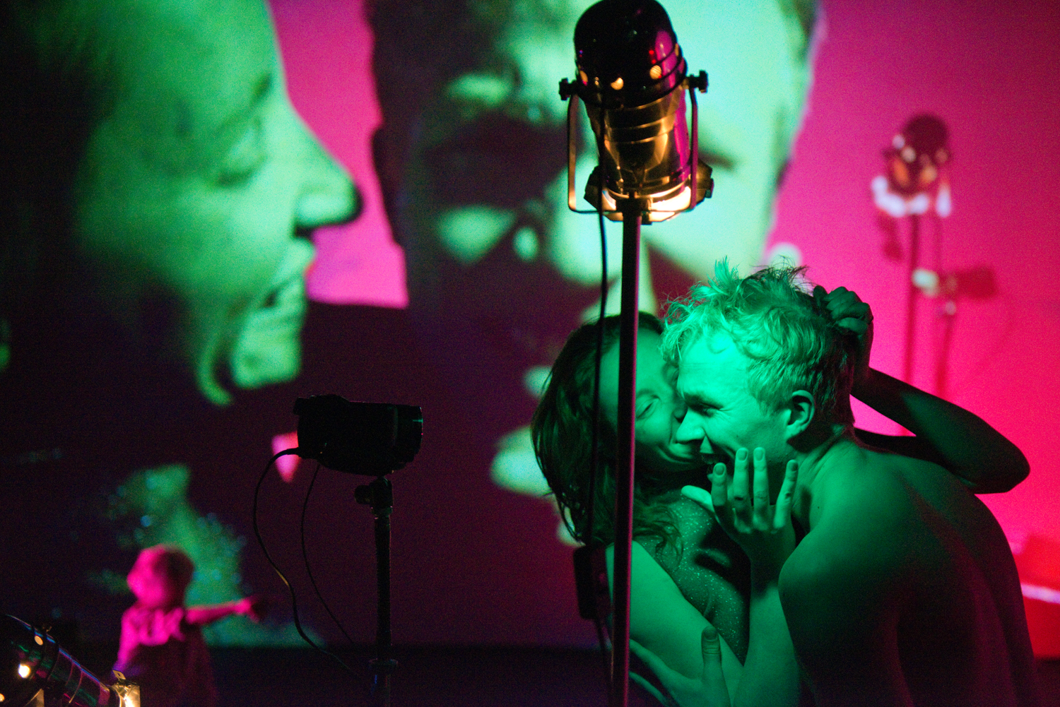 Immer wieder positionieren sich die Darsteller im Laufe der Performance vor den zwei am Bühnenrand aufgebauten Kameras. Während sie sich schminken und ihre blonden 60-Jahre-Perücken zurechtrücken, dominieren die Close-Ups ihrer eigenen Gesichter auf Leinwänden im Hintergrund die Szenerie. Der Zuschauer schaut der überlebensgroßen Projektion direkt in die Augen und das Gesicht scheint wortwörtlich zum Greifen nah. Ein ebenso simpler, wie erstaunlicher Effekt. Beinah fällt es schwer zu glauben, dass das jeweilige Gesicht tatsächlich der entsprechenden Person gehört, welche leibhaftig wenige Meter vor einem steht und doch so viel weniger deutlich und ausdrucksklar wirkt. Die Projektionen sind Momentaufnahmen, kurzlebige Portraits. Üblicherweise wird durch Videokameras etwas festgehalten, etwas dokumentiert. Nicht so in dieser vom Geist der Factory-Superstars geprägten Scheinwelt: hier wird die Kamera eine lebensnotwendige Verlängerung des Selbst, ein unverzichtbarer Baustein der eigenen Identität. Nur was überdeutlich projiziert wird, hat auch Geltung.